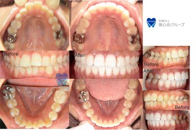 | 治療の内容・詳細 | 出ている前歯を内側に入れるためにIPR(歯のすき間をつくる処置)を行なっています。期間は約3年、上下で拡大床装置を使い、右上1番の唇側傾斜が改善し、しっかり噛めるようになっています。 |