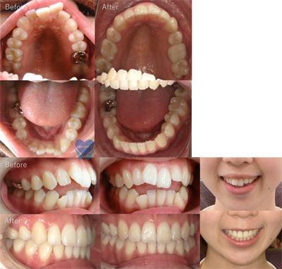 | 治療の内容・詳細 | 元々上下の前歯が噛み合っておりませんでしたが、上の前歯を後ろに下げることで前歯のかみ合わせも良くなっています。 |